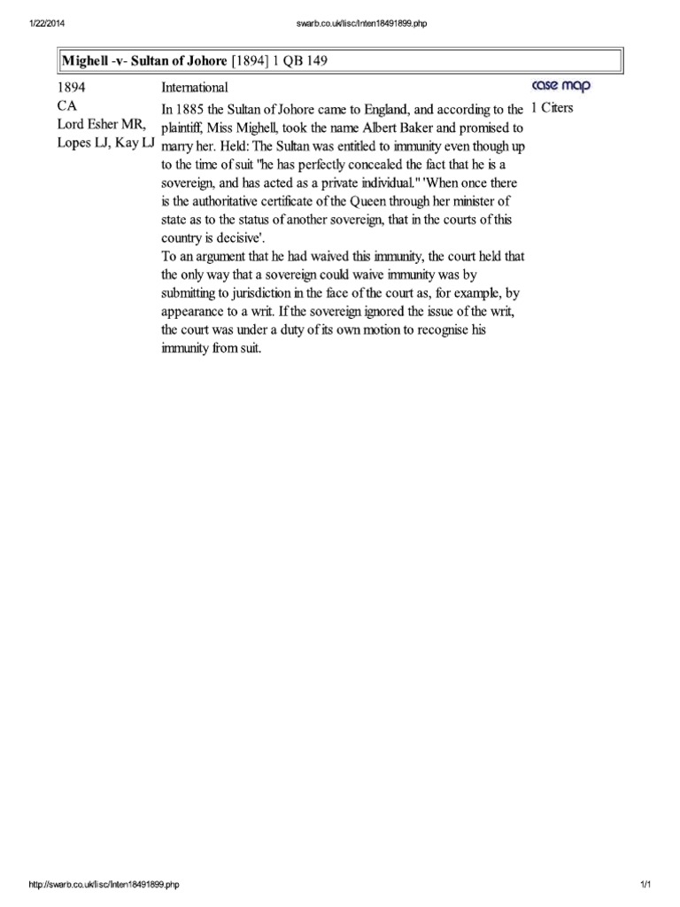 Mighell V Sultan Of Johore 1894 1 Q B Sovereign Immunity Sovereignty