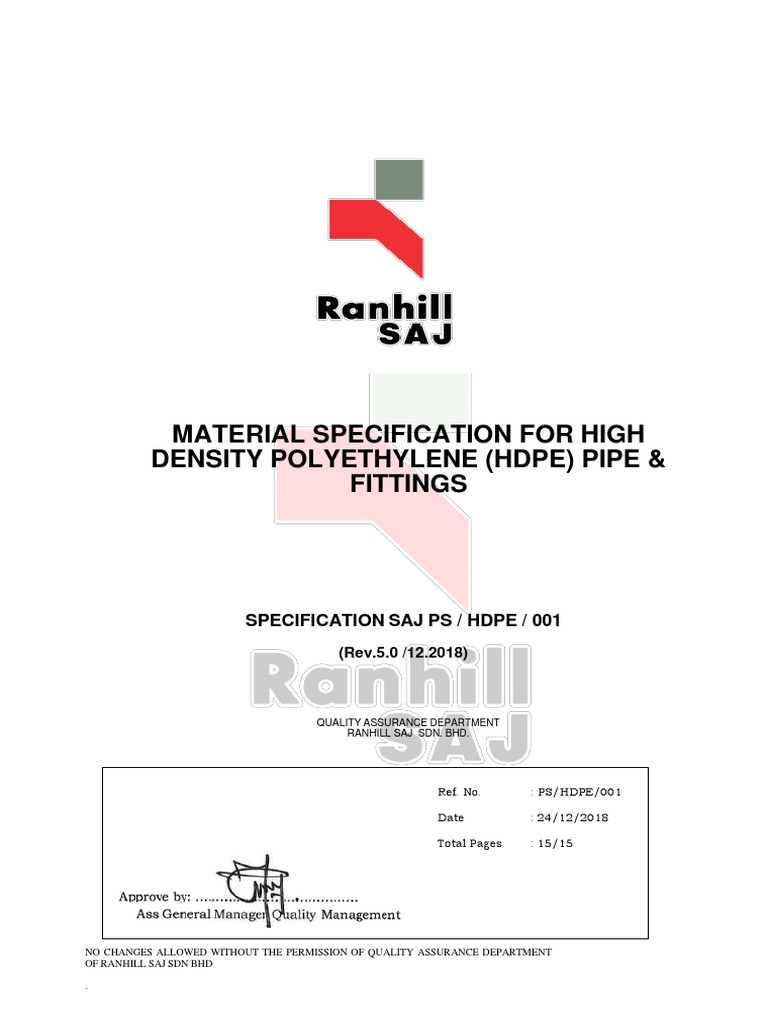 Ranhill Material Specification Hdpe Polyethylene Pipe Fluid Conveyance